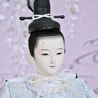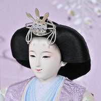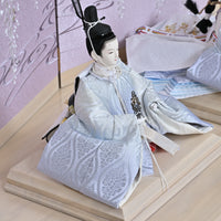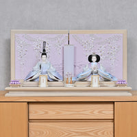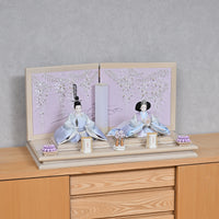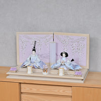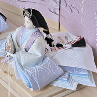 女雛の重ねの色味を抑えることでシンプルモダンな印象に仕上がりました。 御屏風は藤色のぼかしのデザインに藤のお花が優雅に咲き、真ん中の流水の刺繍によって水辺に咲く藤のような風景を感じます。