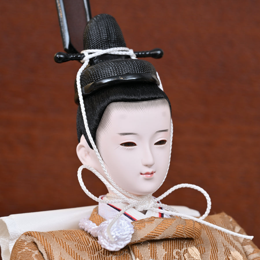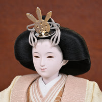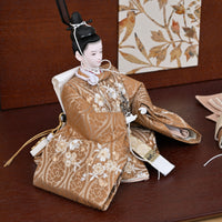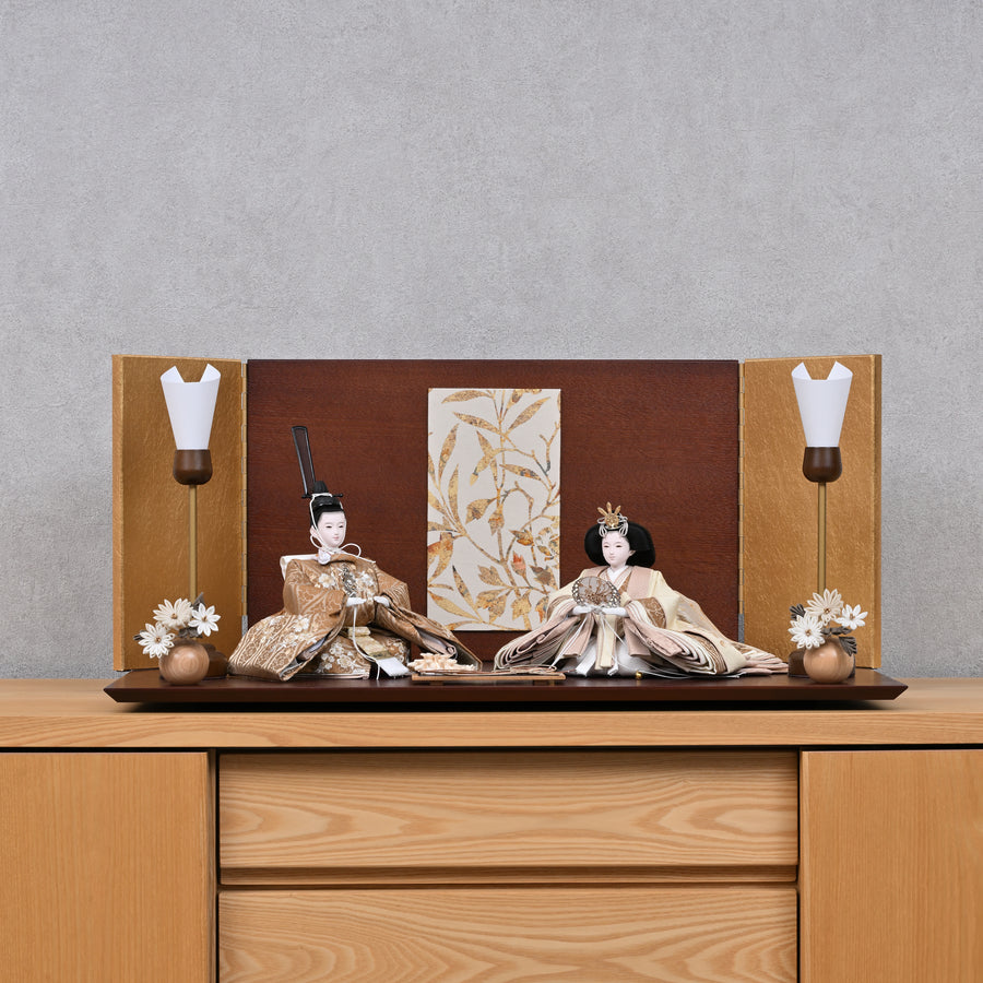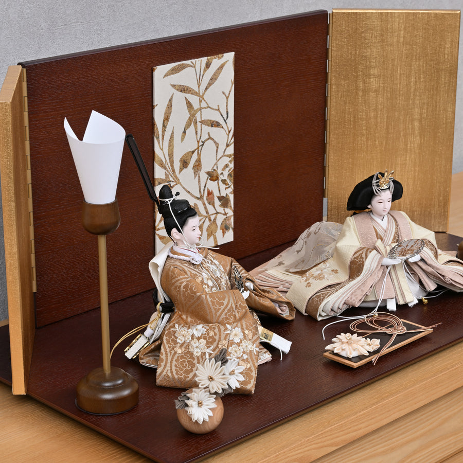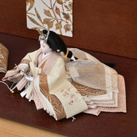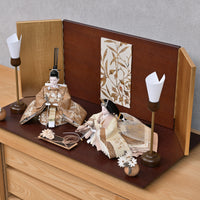 シックでモダン。お衣裳は雲立涌文様に桜のお刺繍が施されたクラシカルなお柄でございます。お色を落ち着いたベージュ系で統一することでシックな印象でございます。お屏風にはブラウンを合わせ、ボタニカルな模様が奥行きを感じます。前飾りには水引がデザインされた可愛らしいお道具を、左右のお花にはお衣裳に合わせたくすみカラーの桜を合わせました。現代のインテリア空間に溶け込む、モダンなお雛飾りでございます。